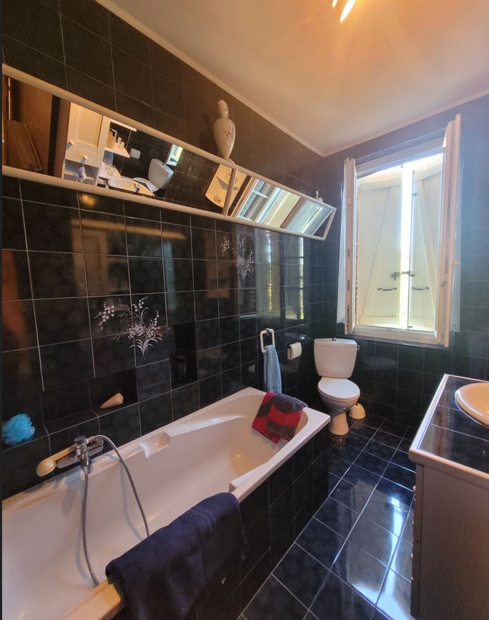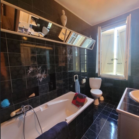 Une salle de bain d’environ 7 m² (baignoire, WC, simple vasque, bidet).