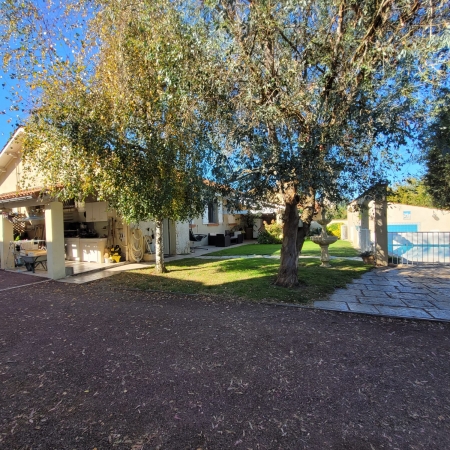 Les extérieurs sont parfaitement aménagés : piscine au chlore 8x4 m, pool house, cuisine d’été, terrasse couverte, et deux garages, un puits.