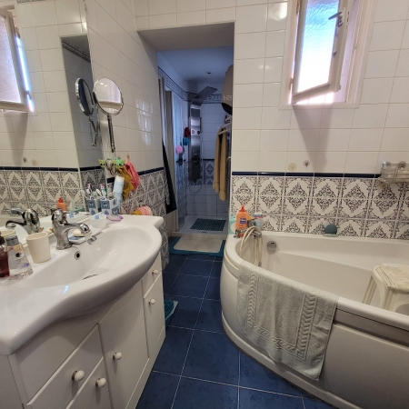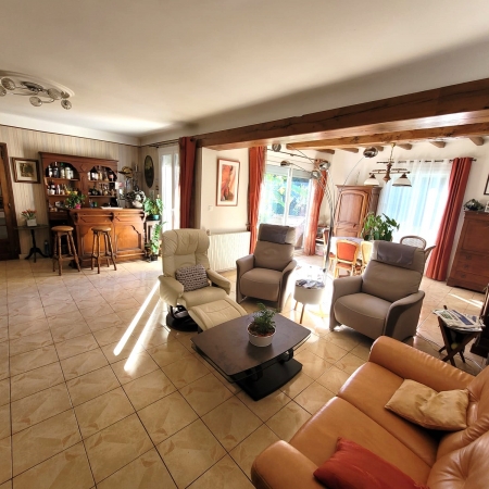 au rez-de-chaussée, un séjour lumineux de 45 m², une cuisine séparée de 11 m² ouverte sur véranda, trois chambres, et une salle de bain complète avec baignoire, douche et bidet.